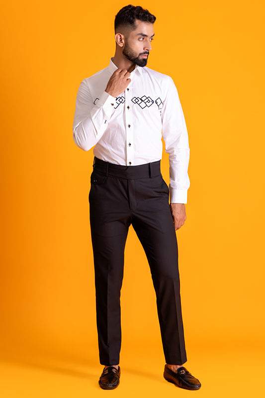 White & Black Contrast Shirt with Embroidered Butterfly Motif