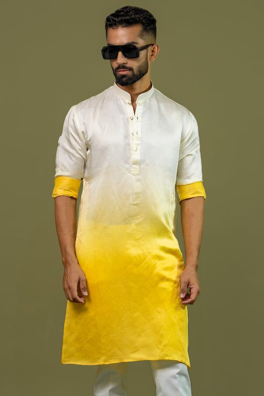 Light Yellow-Yellow Kurta, Assymetric Hem, Dip-Dyed, Side Button