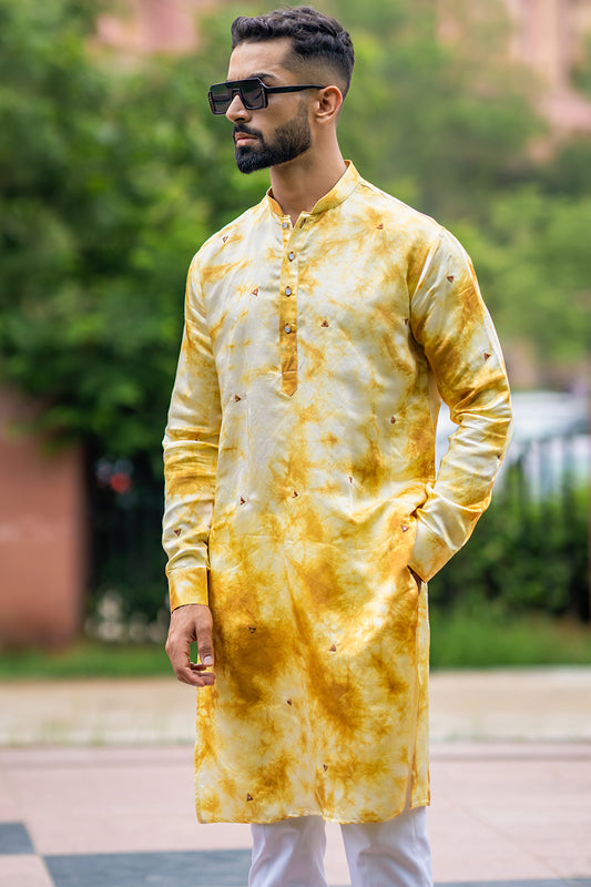 Medallion Yellow Shibori In Linen Satin Kurta