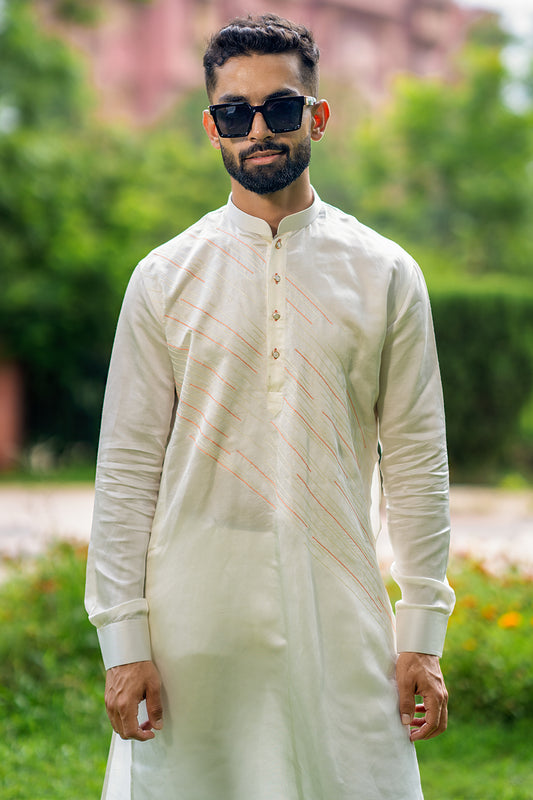 Ivory Kurta With Diagonal Orange And Ivory Threadwork Detailing