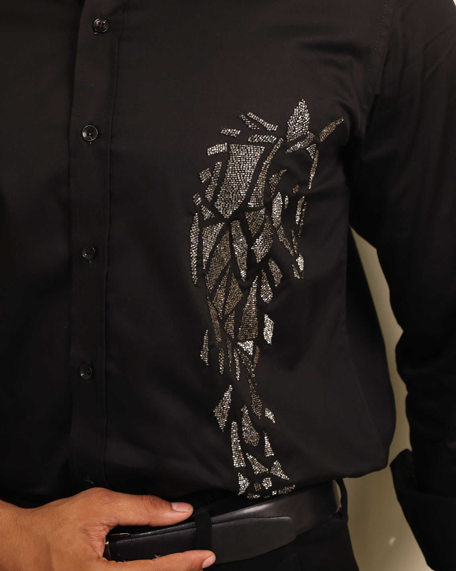 Crafted in premium Giza cotton, the Obsidian Shard shirt from The Stitchery is designed for those who want to make a powerful statement. Set against a deep black base, it features intricate hand-embroidered beadwork arranged in an abstract shard motif. The metallic embellishments catch the light with every movement, adding depth and bold sophistication.