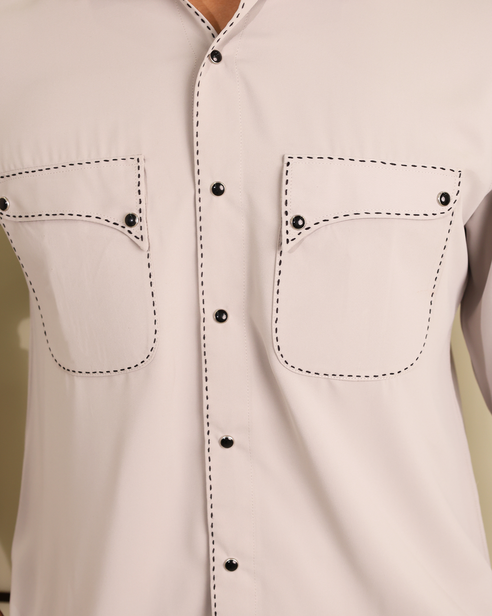 Crafted in premium Giza cotton, the Steel Stitch shirt from The Stitchery brings together comfort, utility, and refined minimalism. The light grey base is accentuated with bold black stitch detailing along the placket, collar, and dual flap pockets—adding subtle depth to a clean silhouette.