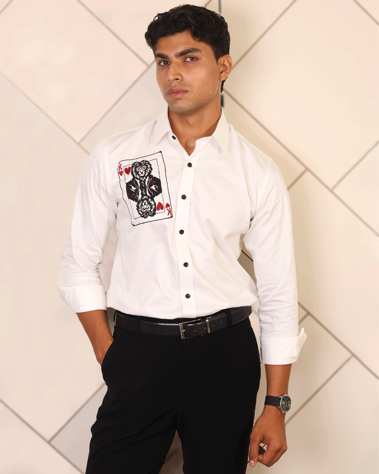 This isn’t just a white shirt — it’s a conversation starter. The Stitchery’s designer piece comes with a bold embroidered playing card motif that instantly grabs attention. Tailored for comfort yet styled for impact, it’s the kind of shirt you’ll want to wear when you’re ready to stand out